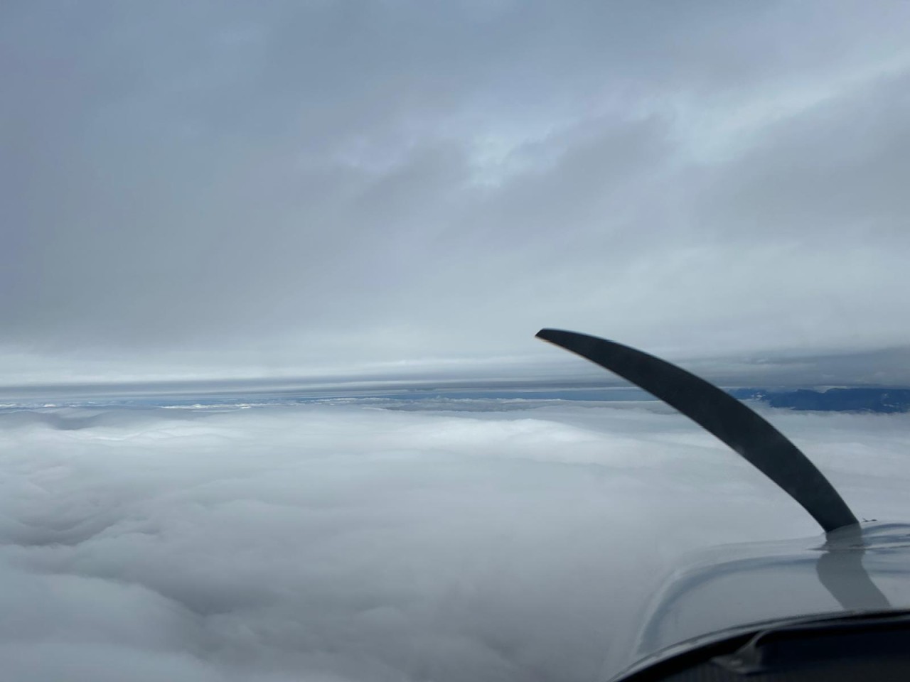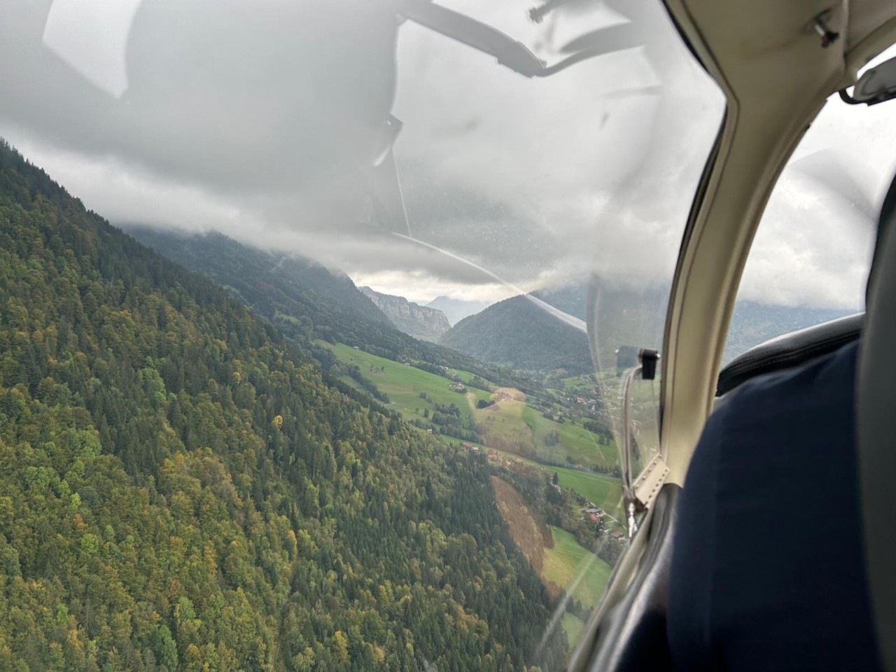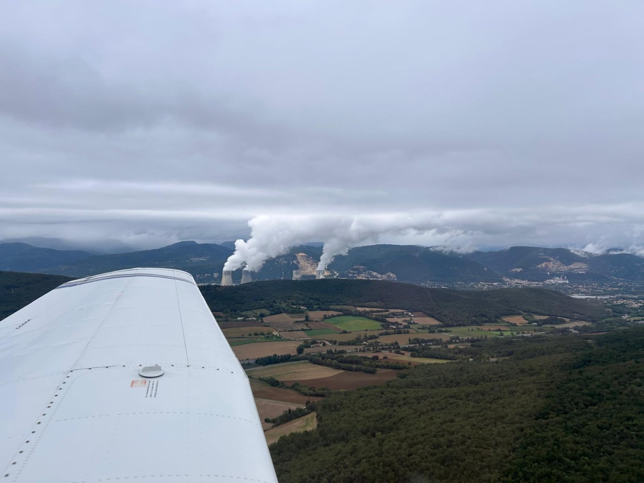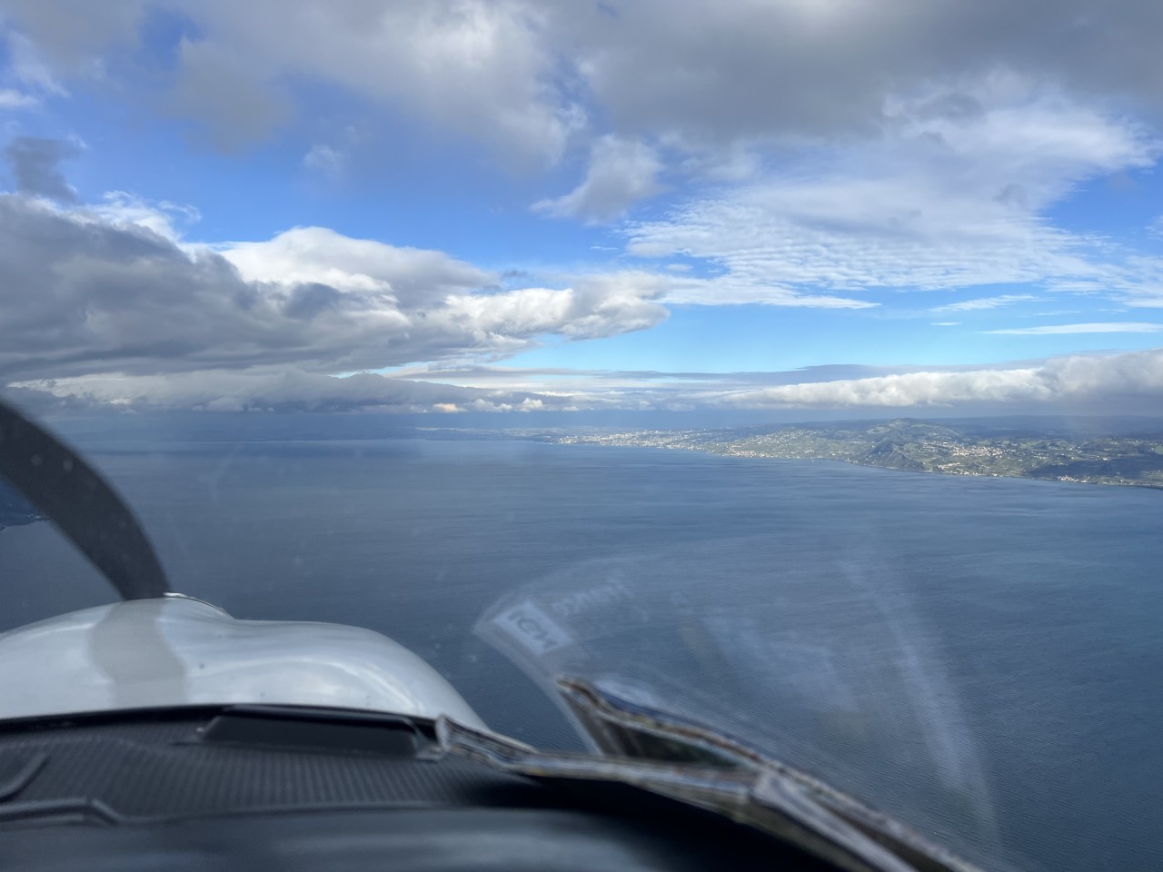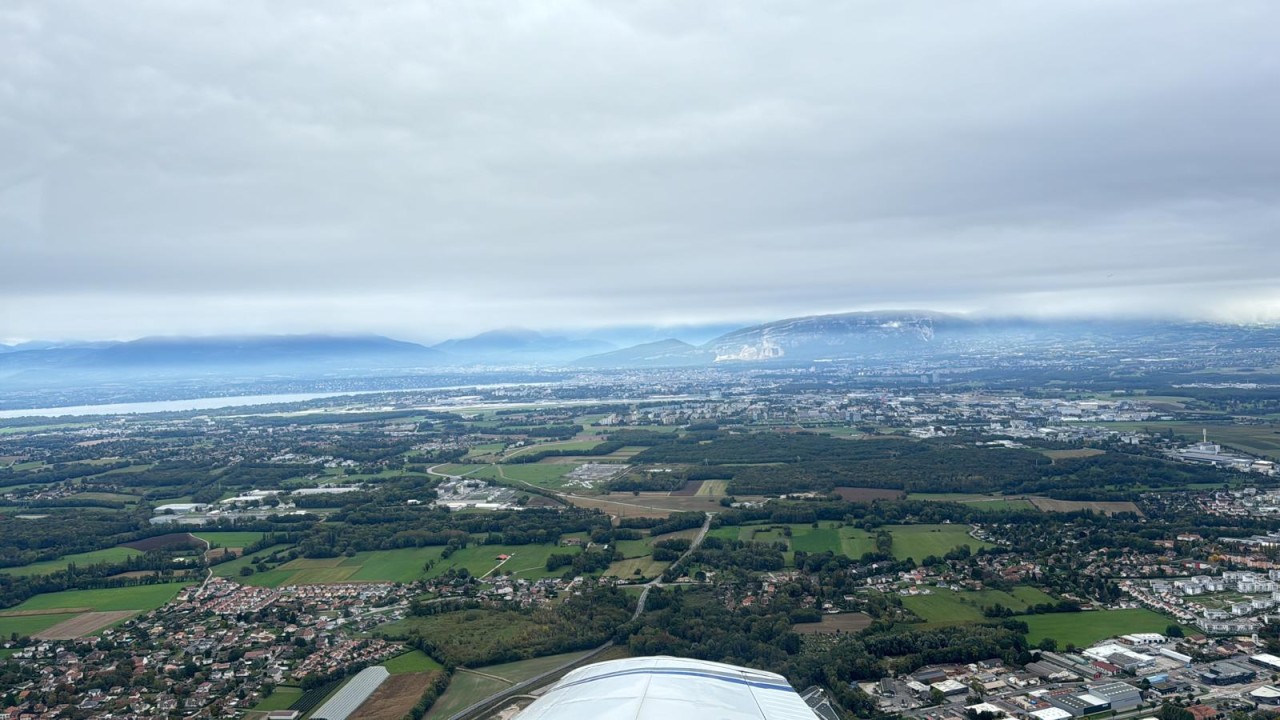 La météo sur le continent s'étant dégradée plus vite que prévue nous décidons de faire une escale à Cannes pour y refaire le plein et la douane, afin d'assurer la montée vers la Suisse au cas où nous devrions prendre une route plus à l'ouest que prévu. Dès le départ de Cannes nous avons compris que la remontée serait plus compliquée que la descente ! La route par Gap étant compromise, nous sommes passés par Sisteron et quelques nautiques plus tard nous avons décidé de tirer vers l'ouest pour rejoindre la vallée du Rhône au niveau de Pierrelatte. La suite du vol, de Valence à Chambéry, c'est très bien passée, la météo s'étant nettement améliorée. De plus, nous avons pu profiter d'un bon vent de dos (tout comme à la descente d'ailleurs !) pour nous ramener chez nous (20-25 kts). Comme toujours la partie compliquée, lorsque la météo n'est pas bonne, est le retour sur la Suisse, avec le choix de passer à l'est ou à l'ouest du Salève : nous avons pris l'option de suivre le Rhône et de passer par Fort-l'Écluse, puis de contourner la CTR de Genève par l'ouest. Choix judicieux, malgré une petite dizaine de minutes de vol au minima VFR. Le passage sur la Suisse, nous a fait retrouver une météo tout à fait confortable et presque ensoleillée pour le retour à Bex.