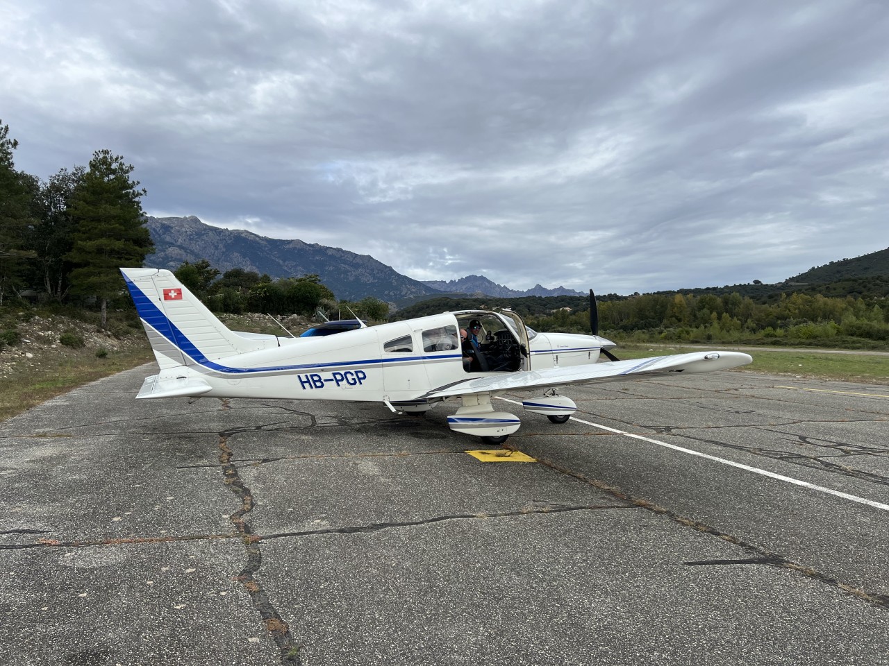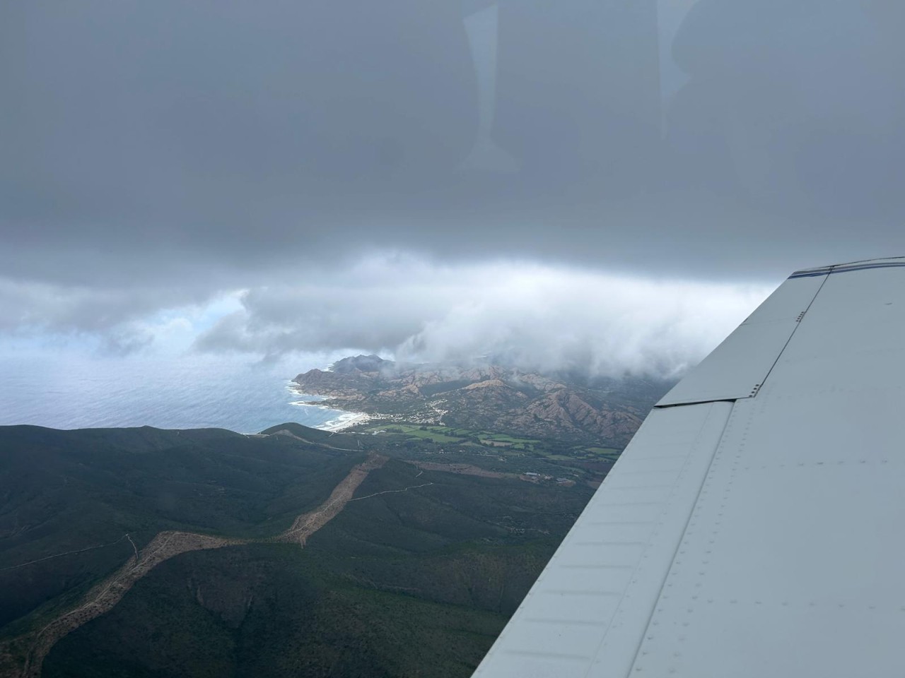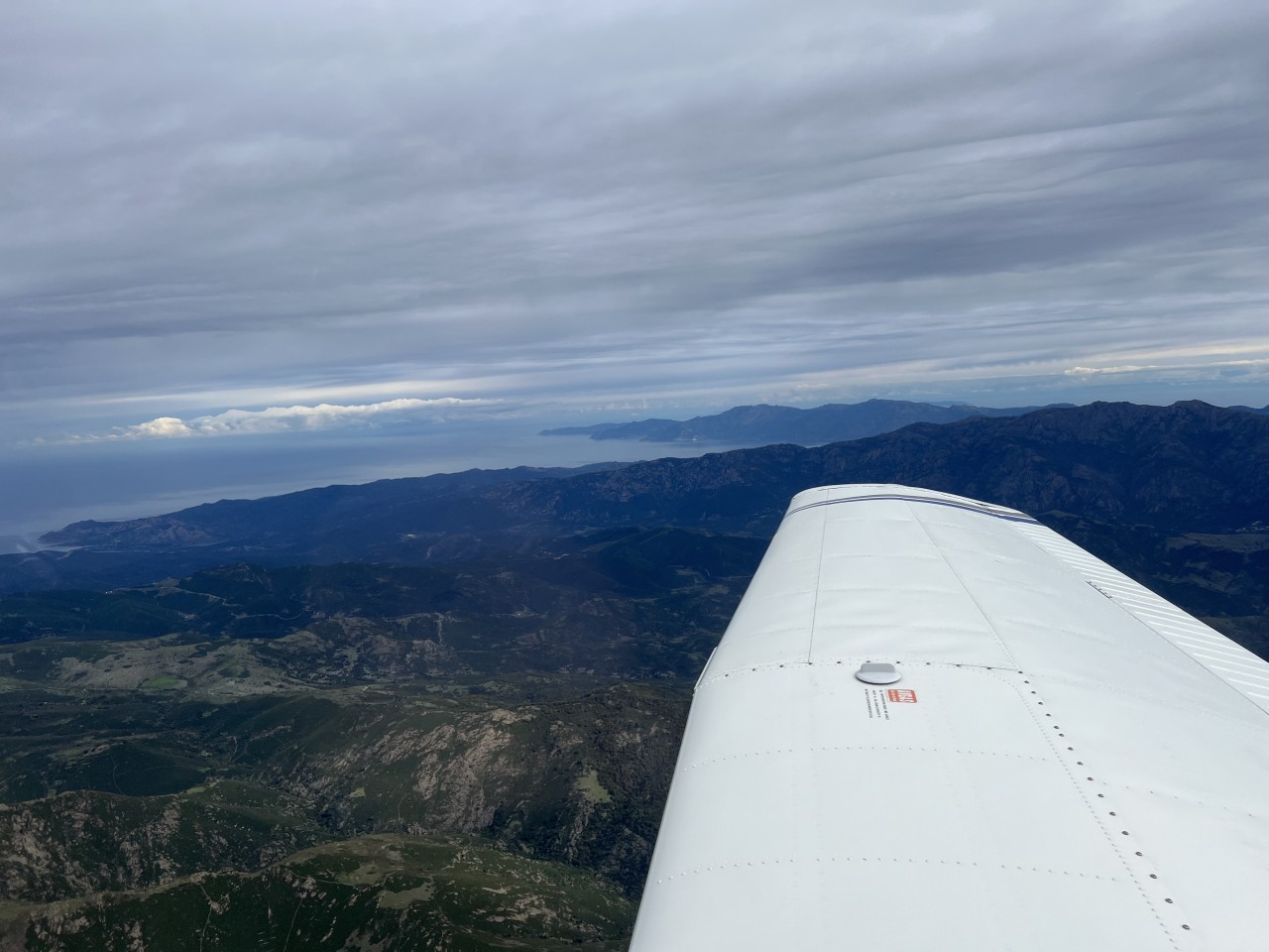 La météo pour la traversée maritime étant correcte sur sa partie ouest, nous décidons de poursuivre vers Corte sans attendre de savoir si la grève serait reconduite à 16h00 ou pas. Nous nous faisons le plein et repartons vers Corte (où il n'y a pas d'AVGAS disponible), non sans avoir organisé un taxi pour nous prendre à l'aérodrome. La traversée vers la Corse se passa magnifiquement bien, nuages hauts, très bonne visibilité. Par contre, l'arrivée sur l'île se compliqua un peu, car la météo ne s'était pas franchement améliorée (contrairement aux prévisions) et l'entrée vers le centre de l'île fut à l'image de la descente vers Gap. À l'arrivée à Corte le centre de plongée de Calvi nous informe qu'un énorme éboulement a eu lieu sur la route entre l'Île-Rousse et Calvi ce qui imposera un détour par les petits villages de montagne. Il est 13h30, la plongée prévue à 14h00 semble compromise... Mais le centre de plongée nous avait dit qu'il serait possible de plonger avant 16h00 si nous arrivons dans ces heures-là.