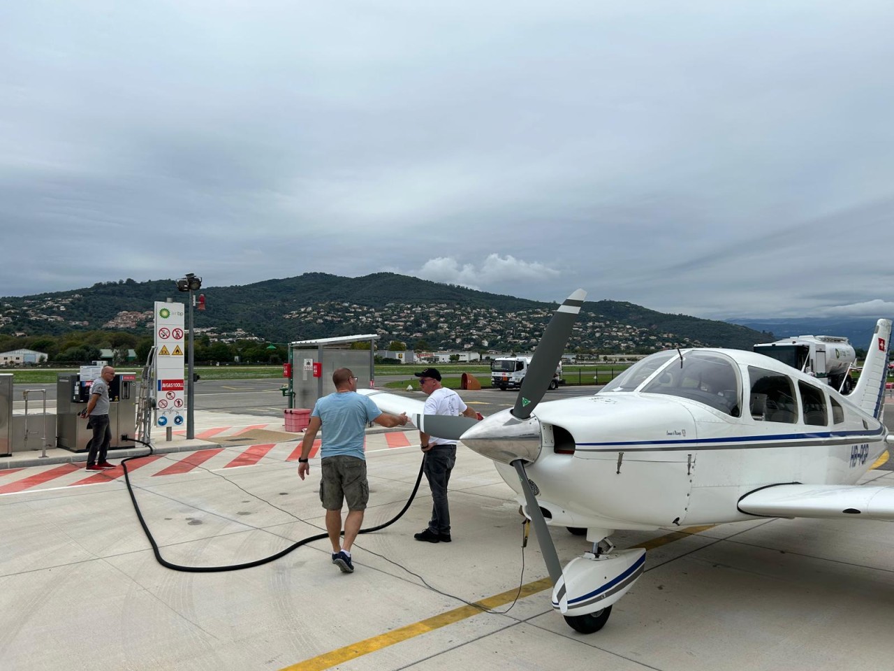 Juste après avoir passé Gap, Marseille INFO nous signale que le mouvement de grève est reconduit jusqu'à 16h00 LT et qu'il n'est pas possible de poser sur un terrain contrôlé en Corse. L'alternative est la suivante : poser sur le continent (Cannes, Cuers, Le Luc ou Le Castellet) ou continuer sur la Corse (Corte, Propriano ou Ghisonaccia). La météo à Cannes n'étant pas bonne du tout, la météo à Calvi pas terrible non plus, la traversée vers la Corse pour Corte (le seul choix raisonnable en termes de distance par rapport à Calvi) nous suggère un arrêt fuel pour assurer un éventuel retour sur le continent. L'option de carrément renoncer à aller jusqu'en Corse est même évoquée. L'aérodrome de Cuers s'impose donc de lui-même, météo excellente et proche de Hyères au cas où nous voudrions plonger ailleurs. Nous y posons pour faire le point des options pour la suite du week-end. L'aérodrome n'étant pas douanier la personne au C, nous dit que normalement nous devrions rester 14 h avant de pouvoir redécoller, mais que compte tenu du contexte de notre atterrissage, il doit pouvoir faire une exception en remplissant quelques documents.